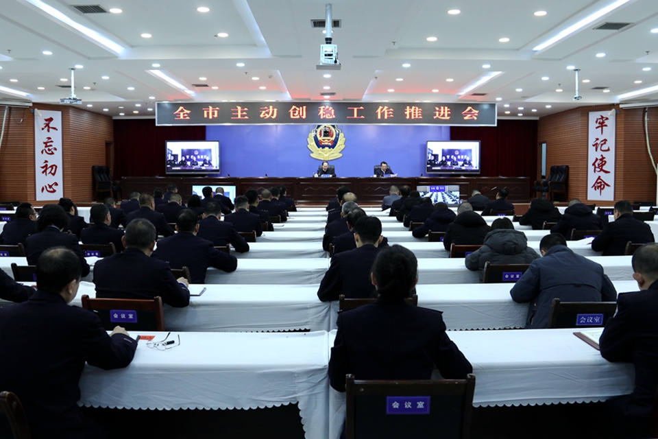 1月19日,全市主动创稳工作推进会召开,学习贯彻习近平总书记重要讲话重要指示精神,传达学习中央政法委、省委政法委有关会议文件精神,安排部署岁末年初安全稳定工作,推进主动创稳走深走实。市委常委、政法委书记邵建斌主持会议并讲话,副市长、市公安局局长郭庆祥安排部署有关工作。