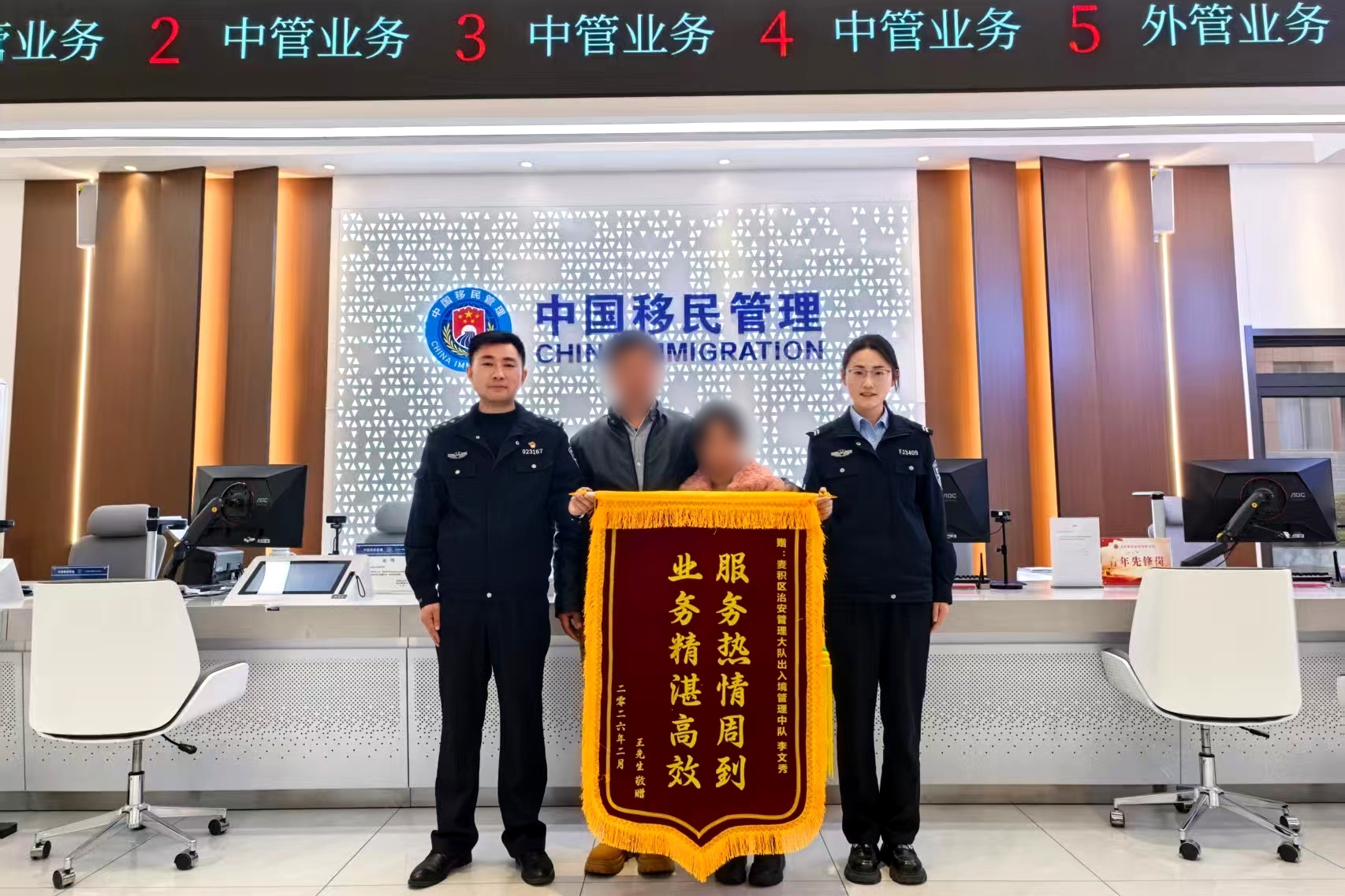 2月25日,麦积分局出入境办证大厅收到一面印有“服务热情周到,业务精湛高效”的锦旗,这是辖区居民王先生为表达对出入境窗口工作人员的感激与赞誉特意赠送的。