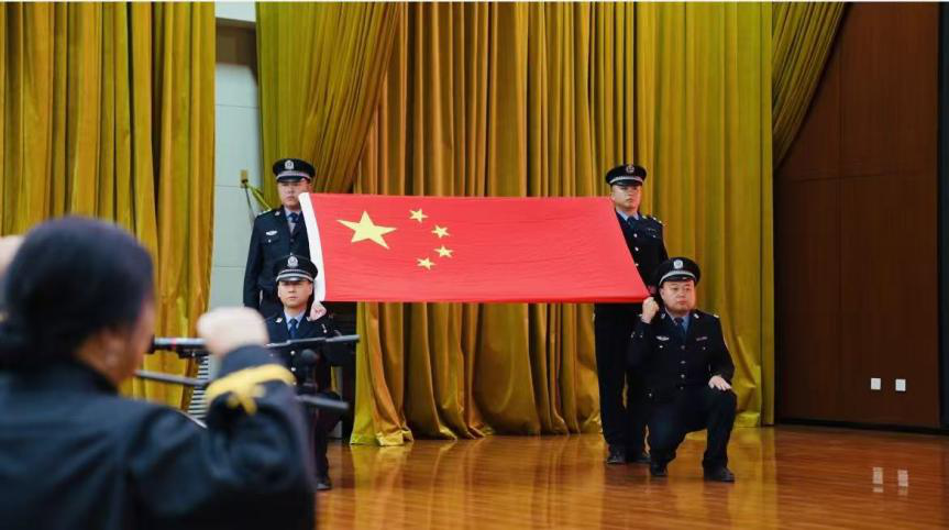 上午8时40分,仪式在雄壮国歌声中启幕。全体干警身着制服、胸佩法徽,列队肃立,神情肃穆。王海洲作为领誓人,左手抚按《中华人民共和国宪法》,右手举拳领诵誓词;全体干警高举右拳,以洪亮坚定的声音跟诵,“忠于宪法、维护宪法权威”的誓言响彻大厅,字字铿锵传递出对法治的尊崇。